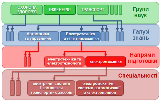 Перелік спеціальностей ЗВО визначений Постановою Кабінету Міністрів від 29 квітня 2015 р. № 266. Споріднені спеціальності згруповані у галузі знань (наприклад, спеціальності 141 Електроенергетика, електротехніка та електромеханіка, 142 Енергетичне машинобудування та ін. входять до галузі 14 Електрична інженерія).